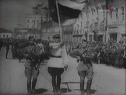 Единственное документально зафиксированное использование трехцветного флага власовцами до 1945 года - парад 1-й Гвардейской бригады в Пскове 22 июня 1943 г: